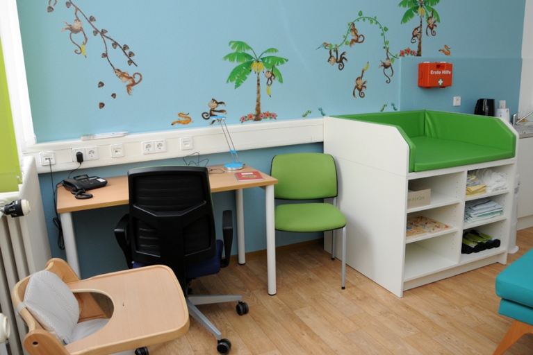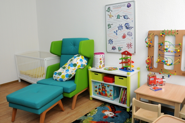 There are many reasons for using the parent-child room. Sometimes, the child is not yet healthy enough to go to Kindergarten after an infection, but there is still an important meeting on campus. Then the meeting can take place in this room. The child can sleep or play, and you are still reachable on campus. Sometimes, the Kindergarten is closed due to a strike. In this case, this room is a good temporary solution allowing you to keep an eye on the children while still being reachable and having access to the Intranet. Or maybe you are pregnant and just need a room where you can rest for fifteen minutes. The parent-child room is equipped for all of these occasions.